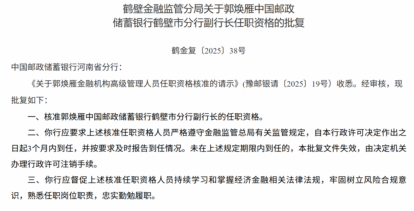 12月9日,鹤壁金融监管分局发布关于郭焕雁中国邮政储蓄银行鹤壁市分行副行长任职资格的批复,核准郭焕雁中国邮政储蓄银行鹤壁市分行副行长的任职资格。